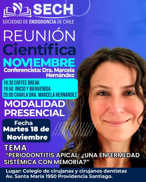 Estimad@s soci@s: Les extendemos una cordial invitación a la Reunión Científica de la Sociedad de Endodoncia de Chile, correspondiente al mes de noviembre. En esta ocasión contaremos con la destacada participación de la Dra. Marcela Hernández, quien dictará la conferencia titulada: “Periodontitis apical: ¿una enfermedad sistémica con memoria?”