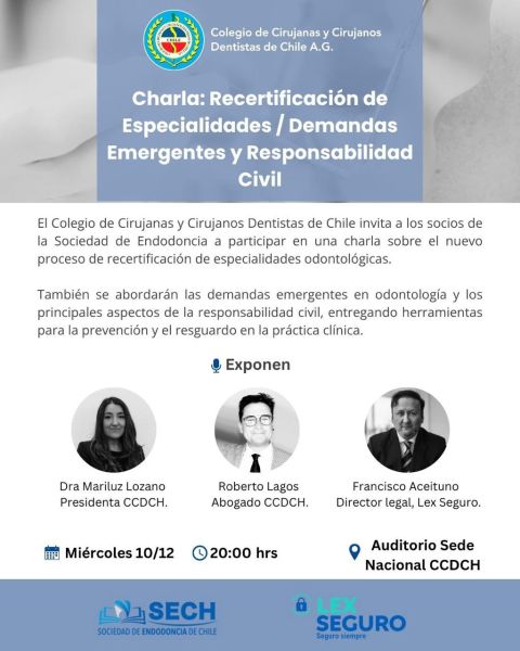 La Sociedad de Endodoncia de Chile invita cordialmente a todas y todos sus asociados a participar de la charla organizada por el Colegio de Cirujanas y Cirujanos Dentistas de Chile titulada “Recertificación de Especialidades Odontológicas, Demandas Emergentes y Responsabilidad Civil”.